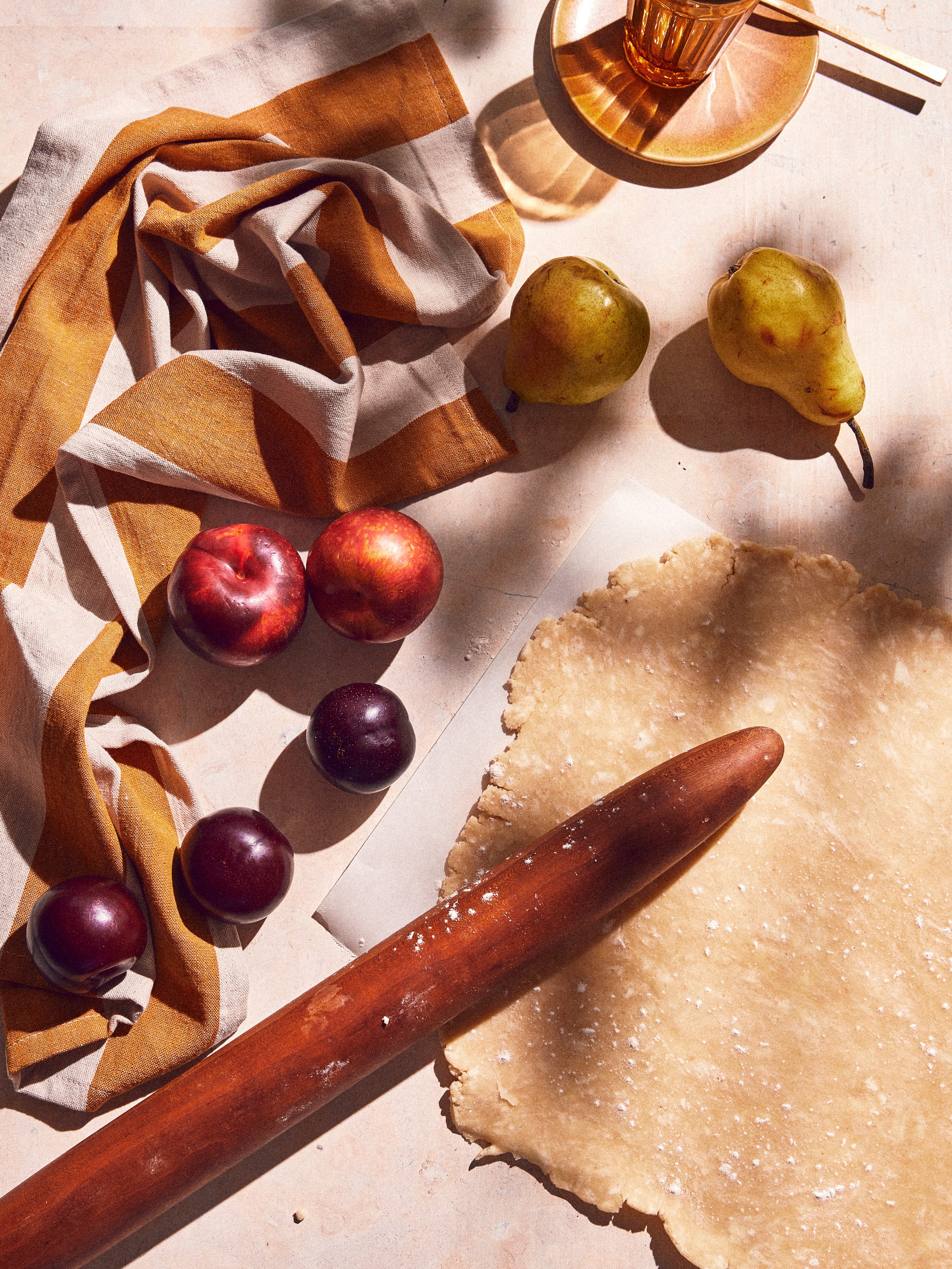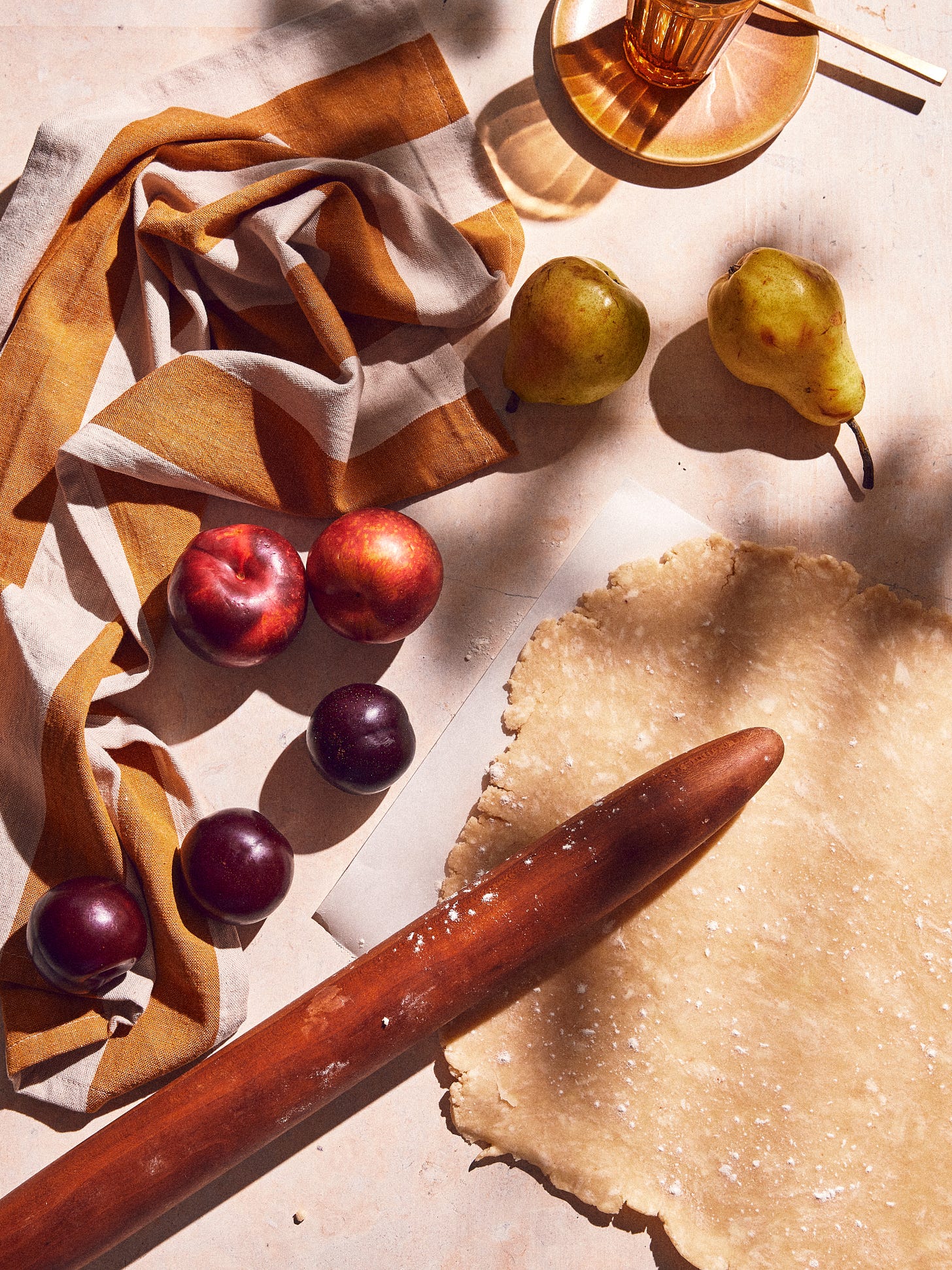 5. MAKE THE FILLING: Toss the pears and plums with the sugar, cinnamon, and salt. Remove the top piece of parchment from the dough and sprinkle the center 2/3s of the round with the flour. Transfer the fruit into the dough, mounding slightly in the center (over the flour) and leaving 2 to 3 inches around the outside. Fold the dough all around to enclose the filling, leaving the center 2/3s uncovered. Overlap the dough and pinch as needed.
